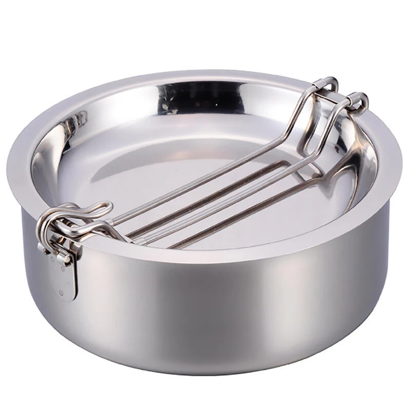 Ensemble de casseroles en acier inoxydable pratique et robuste, comprenant une casserole, une poêle et une assiette profonde. La casserole et la poêle ont des poignées pliables.